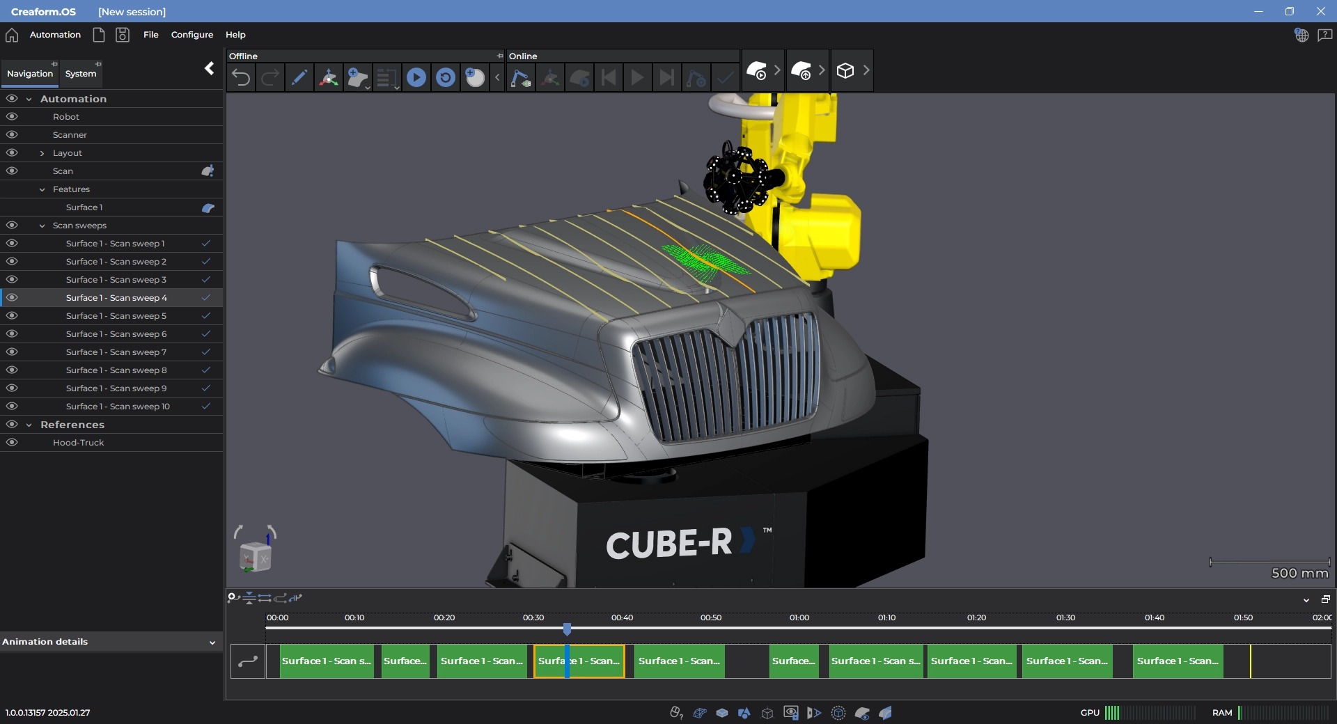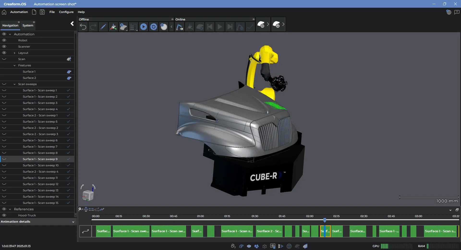 자동화 모듈은 실제 시뮬레이션 모델을 적용하여, 충돌과 특이점 없이 스캐너 성능에 최적화된 로봇 경로를 생성합니다.
